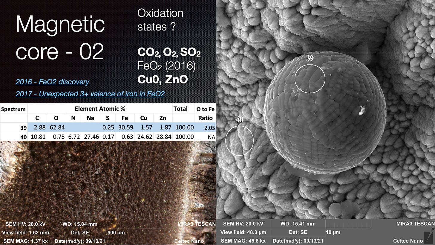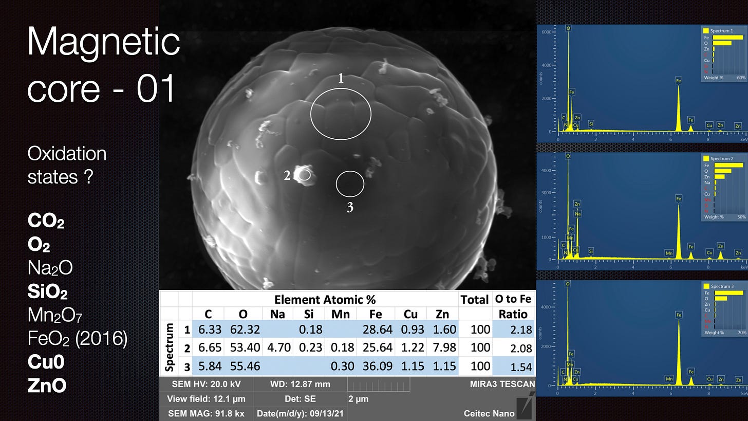 that, when excluding other atoms, the Fe:O ratio is above 2 - however, there is so much carbon, and this can have a C:O ratio of 2 also and we also do not know if there are compounds containing C,O and H as we cannot see H on EDS. Moreover, the sample is on a carbon tape so it may have acquired C from that. So more testing needs to be done. The use of Cu mounting will help determine if these spheres have a ratio above 2. As I said, in the presentation at the top of this blog, in the ULTR experiments - the action is occurring in a water rich environment - VEGA is a low pressure residual air. There is less chance for contamination in the VEGA experiments if the spheres are suspended in a micro Ball Lightning / cohering structure during formation. The VEGA Valley sphere surfaces certainly look a lot 'purer'.