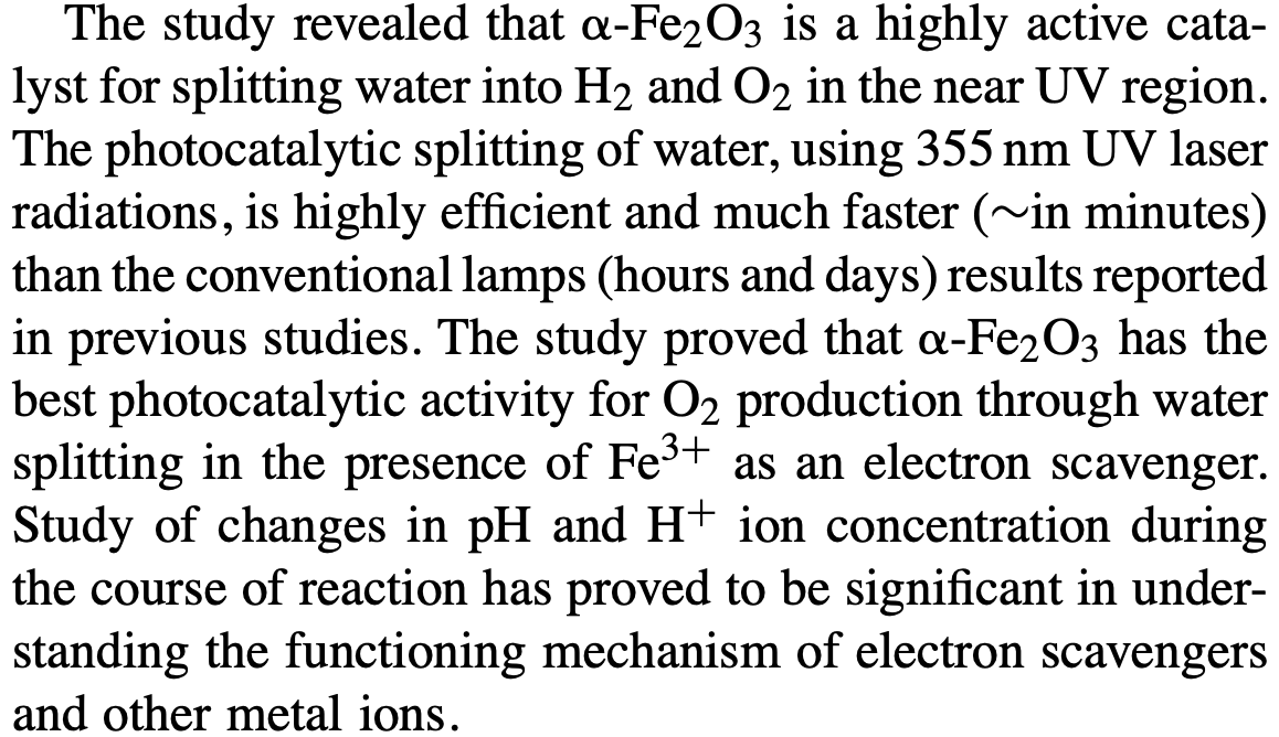 More specifically, with reference to this phrase “The study proved that Fe2O3 has the best photocatalytic activity for O2 production through water splitting in the presence of Fe3+ as an electron scavenger.”