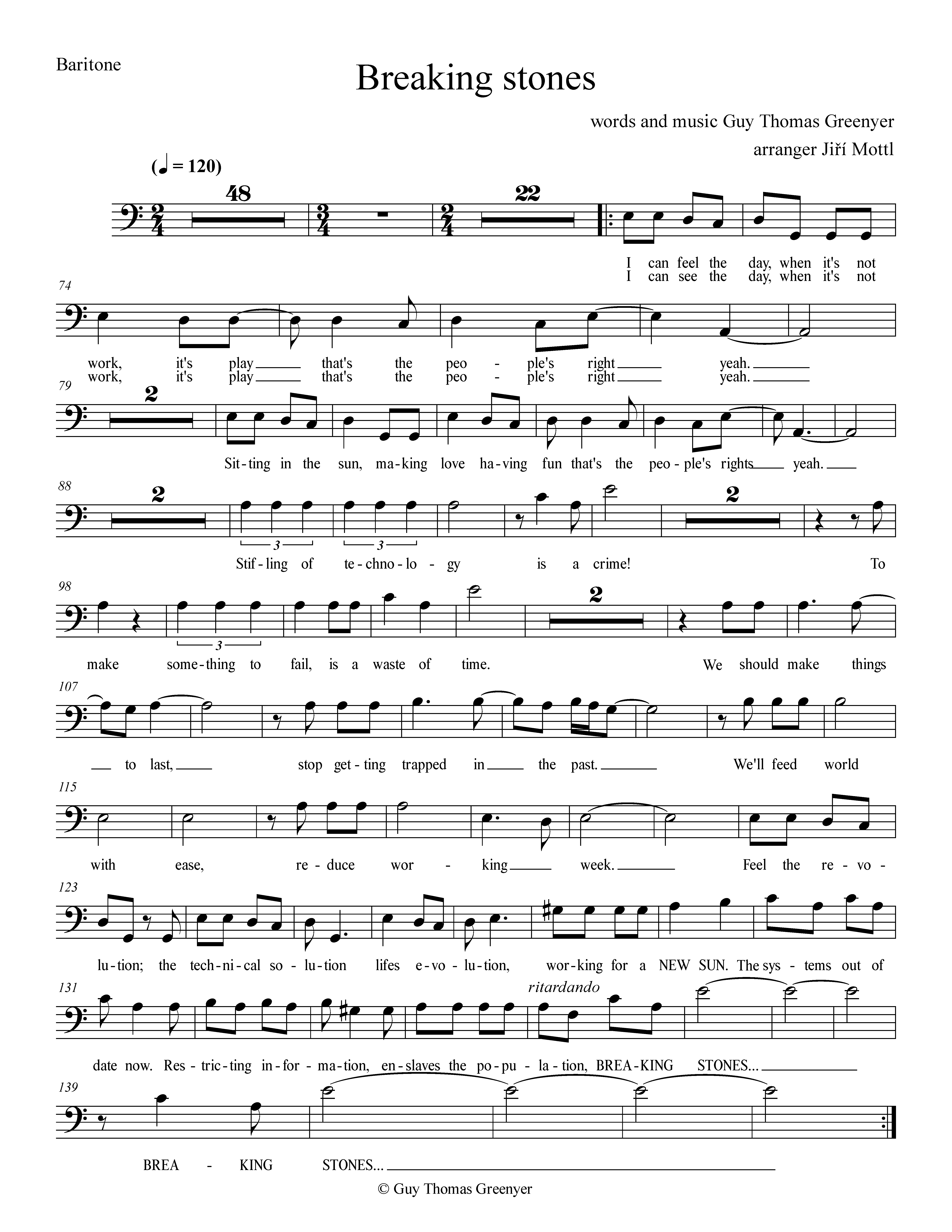 I commissioned a musician, Jiří Mottl, to make an initial arrangement of ‘Breaking Stones’, a song written by my brother Guy in 1999 that he donated to the MFMP in 2012 for when it became appropriate to use. I have worked with Jiří to produce an initial vocal and piano score and provide a midi file.