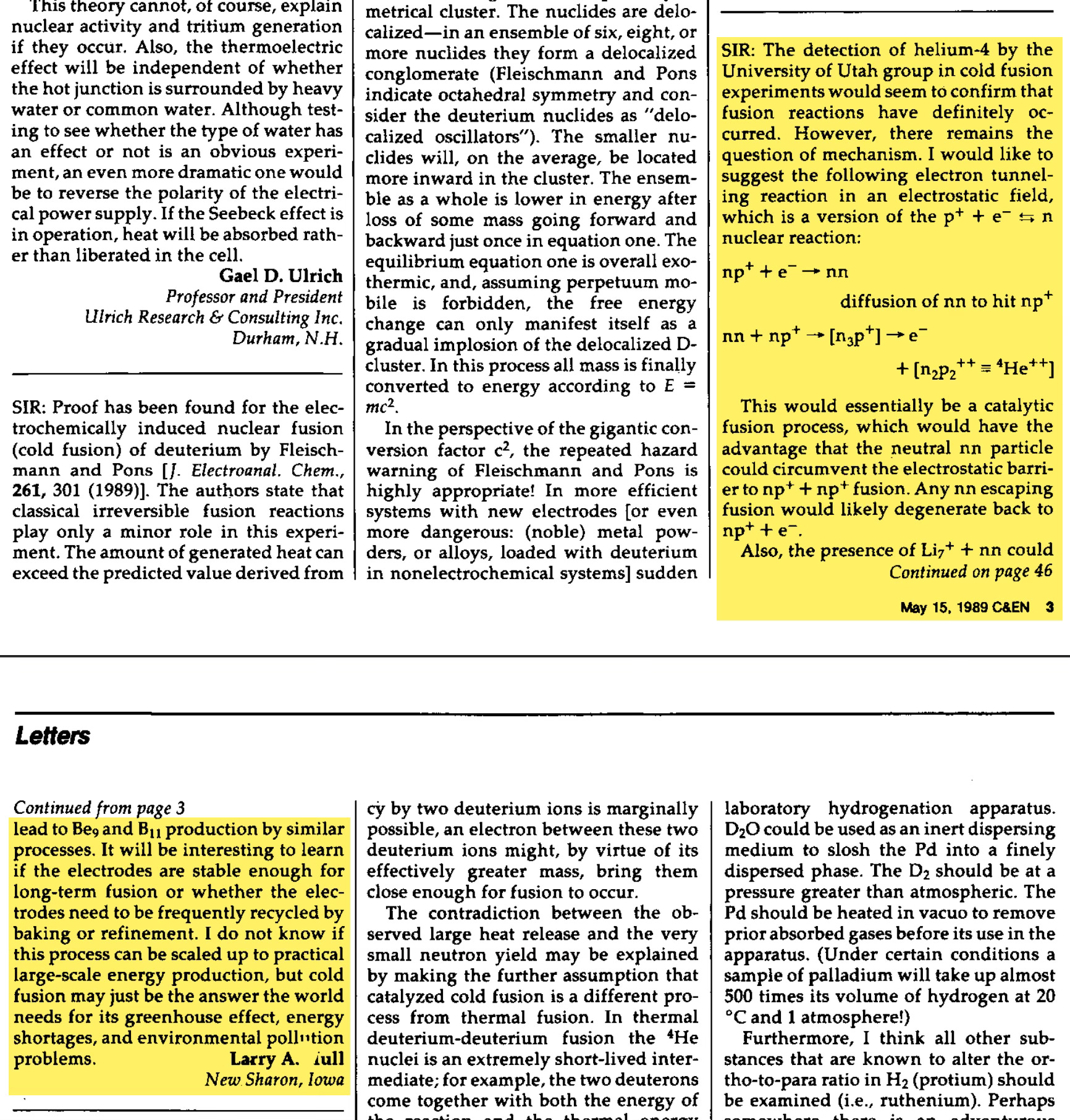 Update #1 - Hypothesis in May 1989 by Larry Hull refers effectively to production of Hydrogen-4 via electron capture leading to 4He