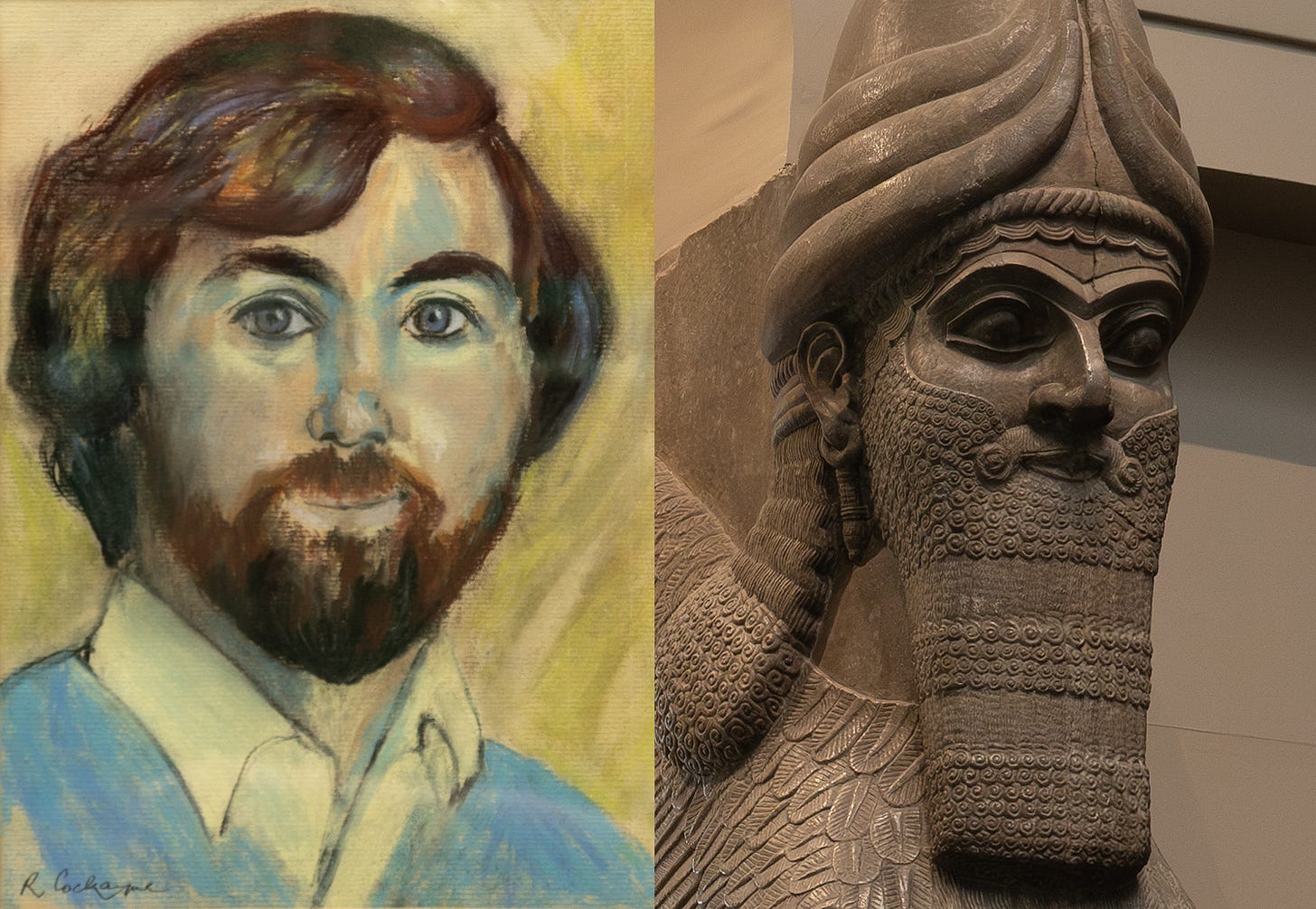 Of the personal things we did not take, there was a pastel drawing of LION, that I have since been given permission to share. It was I think from perhaps 35 years earlier than when I first met him. When I met him, his brow was more connected and his beard was long and bushy, perhaps you can see why I said he looked like the head on the human headed lion Assyrian gate guard I had imaged a few days prior in the British Museum.