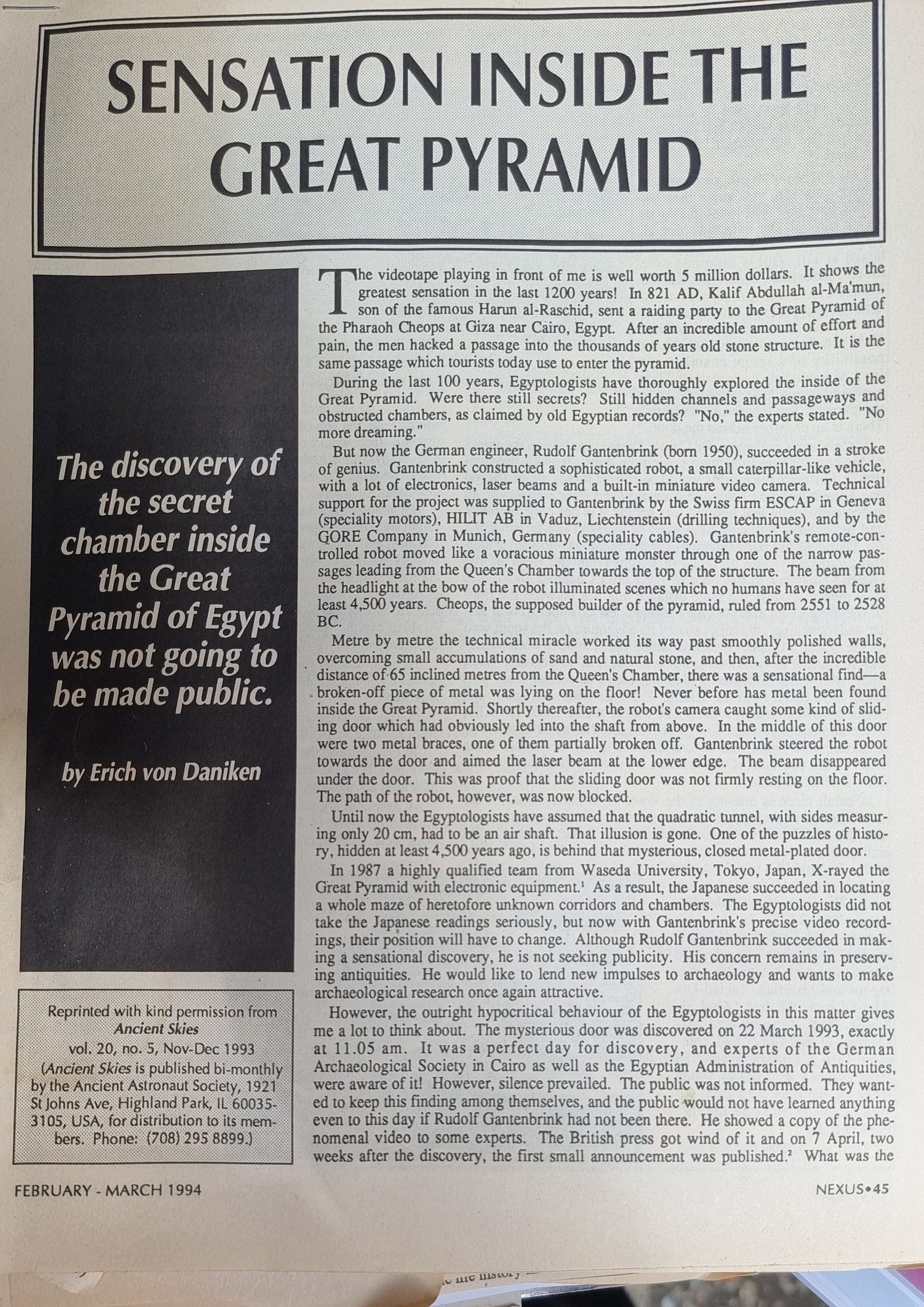 As the documents came out, the very first one was an article from ‘Nexus’ magazine from February / March 1994. It was about the first new finds in the Great Pyramid of Giza in 1200 years! I had no idea that LION had such a long standing interest in the Great Pyramid, but any doubt was dispelled when several annotated books on the subject were handed to me. I thought I knew him well, but there was clearly many interests he had away from the LION reactors themselves. It must have been odd for him, when I apparently randomly started discussing this last remaining wonder of the ancient world.