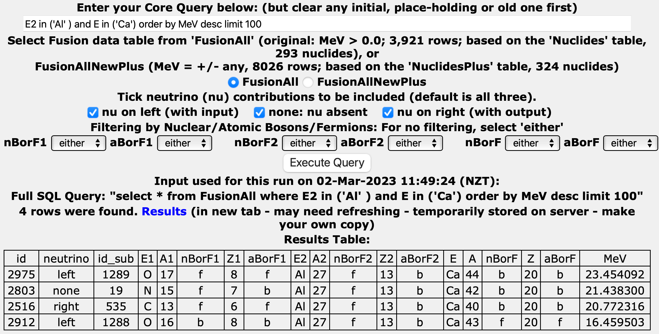 E2 in ('Al' ) and E in ('Ca') order by MeV desc limit 100