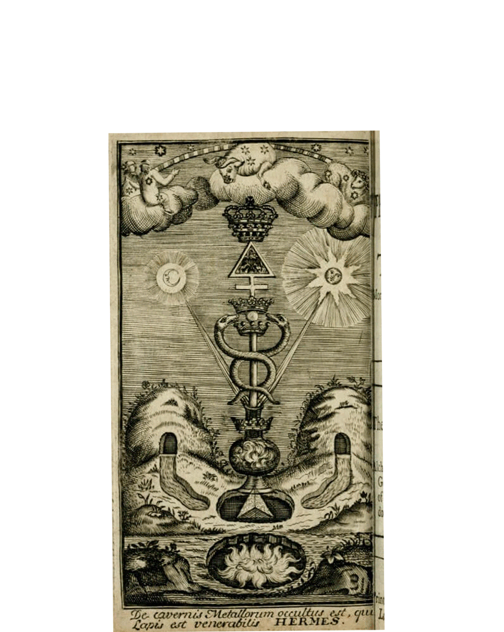“De Cavernosi Metallorum Occultus est, qui Lapis es Venerabilis. [Of the Cave of the Hidden Metals, you are the Venerable Stone.] HERMES”- Frontispiece from : The Hermetical Triumph: or, The Victorious Philosophical Stone. - Anonymous, 1740.