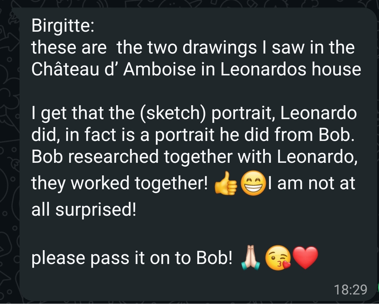 Birgitte, a painter of the elite and royalty of Europe and a strong believer in reincarnation, saw the above image sketched by Leonardo da Vinci at his resting place in the Royal Château of Amboise and was convinced it was a representation of myself in a former incarnation and that I had researched together with Leonardo.