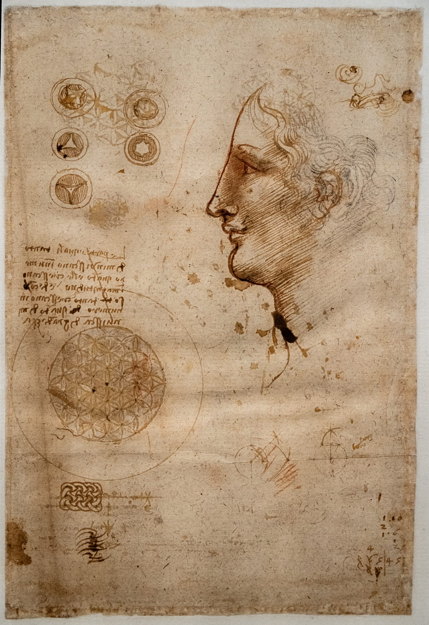 This sheet, in its fragmentary aspect, testifies to the breadth of Leonardo’s method: observing, measuring, and playing with forms to understand the profound harmony that governs the world.