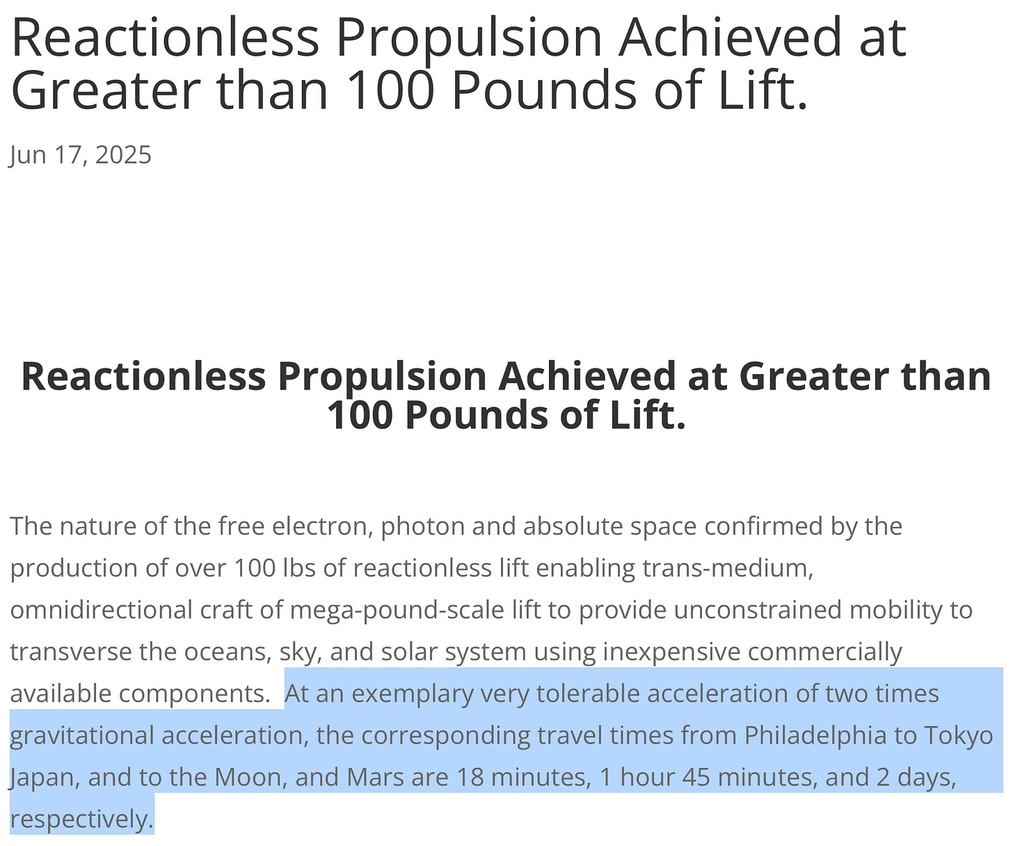 "Reaction-less propulsion enabling 2 day trip to Mars"