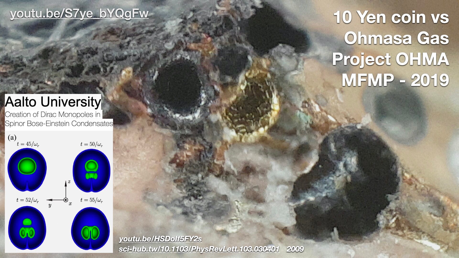 So, we can reasonably say that the features on Ohmasa Gas treated 10-Yen coin (2019) and Hutchison Effect exposed ‘Ball Burn’ (1986) sample are likely due to coherent matter BEC states in the form of ball lightning, which mainstream science calls a Shankar skyrmion (2018), and that they have Dirac monopole like aspects to them.
