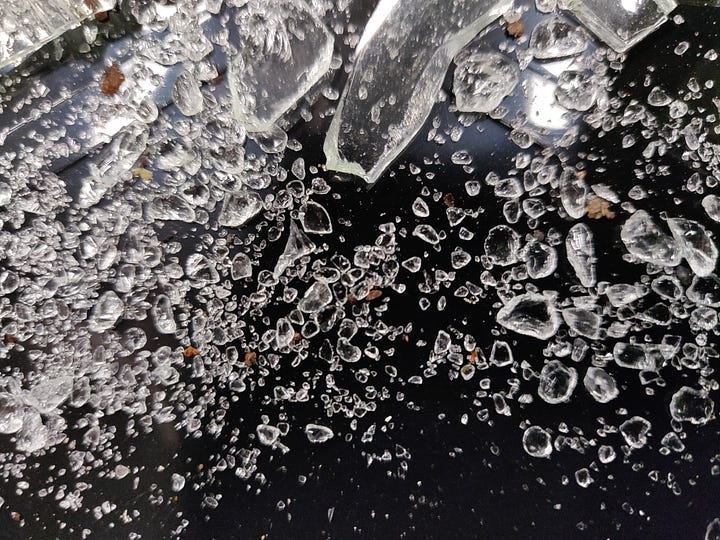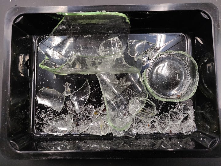 Glass bottle - It held up for a while, then it disintegrated in an instant into smaller pieces which then tumbled into small round balls and even dust
